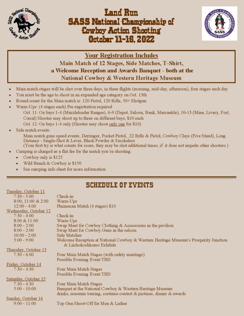 The Oklahoma Territorial Marshals created Land Run in April of 1994. From 2015 to 2017 we hosted a second match each year, Red Dirt Rampage, the SASS Southwest Regional; in 2018 we combined the shoots under the name Land Run. Land Run has continued to grow over the years, with each evolution getting bigger and better. In 2022 Land Run will evolve once again, this time, into the SASS National Championships of Cowboy Action Shooting and Wild Bunch Action Shooting.